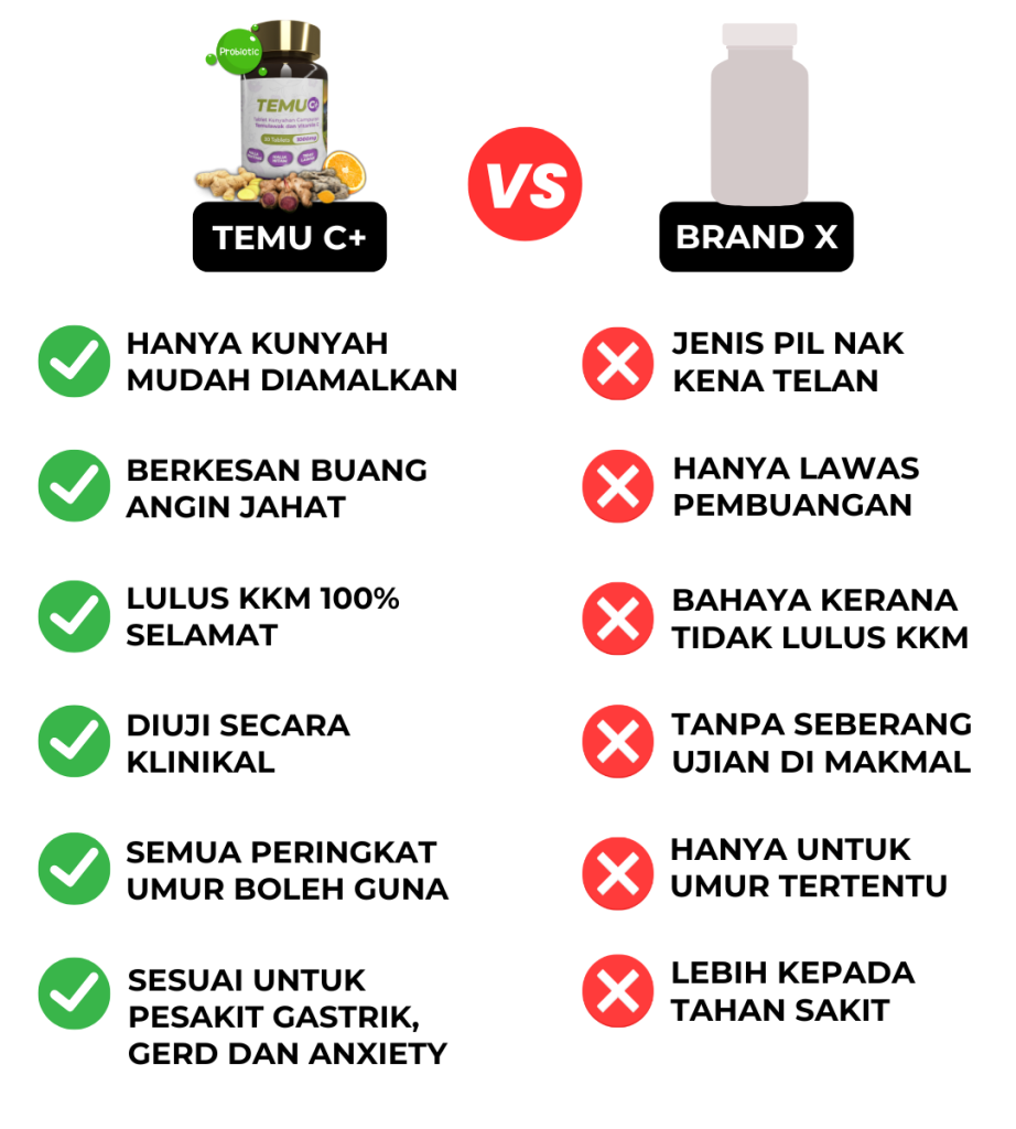 Temu C+ dibuat dari bahan semulajadi, tiada sebarang kesan sampingan. Anda boleh tanya dengan doktor peribadi dulu.